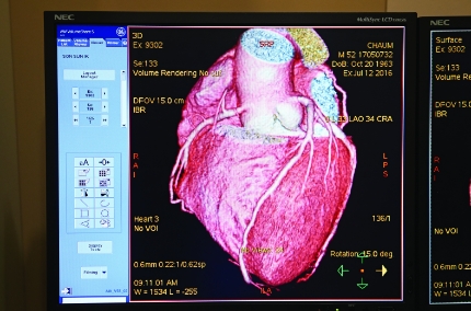 CT 관상동맥* 조영술로 조영제를 정맥 주사하여 최첨단 컴퓨터단층촬영기로 심장 관상동맥의 죽상동맥경화와 협착의 정도를 확인할 수 있는 편리한 검사입니다. 짧은 시간 동안 얻은 다양한 영상정보를 컴퓨터에서 3차원으로 재구성하게 됩니다.